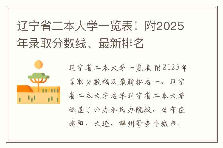 辽宁省二本大学涵盖了公办和民办院校,分布在沈阳、大连、锦州等多个城市,以下为完整名单。