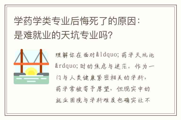 理解你在面对“药学天坑论”时的焦虑与迷茫。作为一门与人类健康紧密相关的学科,药学常被寄予厚望,但现实中的就业困境与学科难度也确实让不少学生发出“后悔”的感慨。以下从客观角度分析药学类专业的现实困境,希望能帮你更理性地看待这个问题。