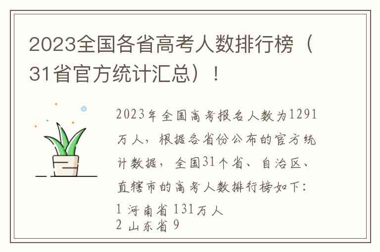 2023年全国高考报名人数为1291万人,根据各省份公布的官方统计数据,全国31个省、自治区、直辖市的高考人数排行榜如下:
