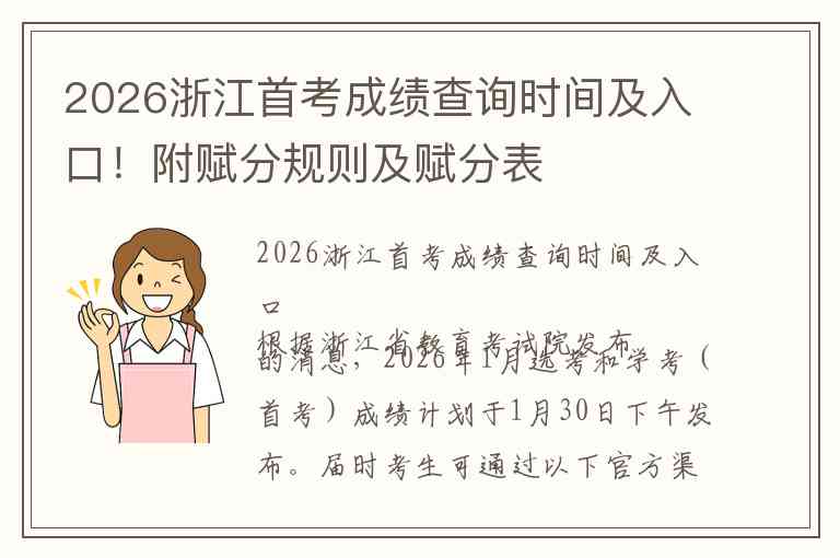 根据浙江省教育考试院发布的消息,2026年1月选考和学考(首考)成绩计划于1月30日下午发布。届时考生可通过以下官方渠道查询成绩: