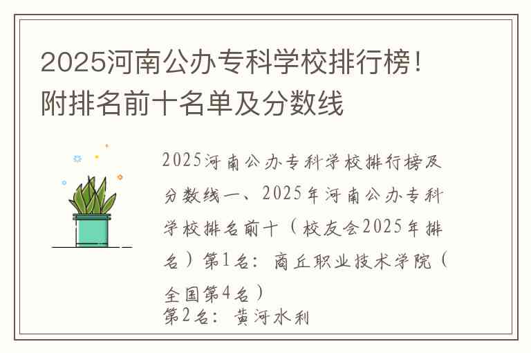一、2025年河南公办专科学校排名前十(校友会2025年排名)
