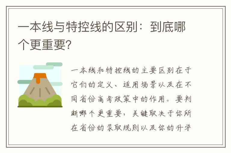 一本线和特控线的主要区别在于它们的定义、适用场景以及在不同省份高考政策中的作用。要判断哪个更重要,关键取决于你所在省份的录取规则以及你的升学目标。