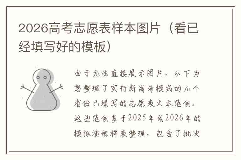 由于无法直接展示图片,以下为您整理了实行新高考模式的几个省份已填写的志愿表文本范例。这些范例基于2025年或2026年的模拟演练样表整理,包含了批次、志愿序号、院校及专业信息等核心字段,您可以参考其格式进行模拟填报。