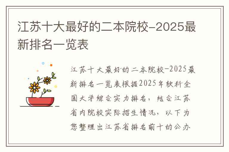 根据2025年软科全国大学综合实力排名,结合江苏省内院校实际招生情况,以下为您整理出江苏省排名前十的公办二本院校。需要注意的是,江苏已合并本科一批和本科二批为本科批,以下院校均指在本科批次招生、非双一流建设高校中的公办本科院校。