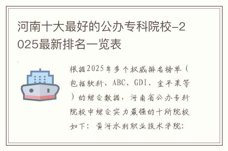 根据2025年多个权威排名榜单(包括软科、ABC、GDI、金平果等)的综合数据,河南省公办专科院校中综合实力最强的十所院校如下: