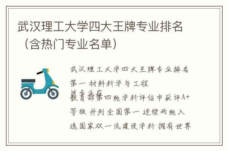 除上述王牌专业外 武汉理工大学的热门专业还包括汽车服务工程 无机非金属材料工程 复合材料与工程 新能源材料与器件 轮机工程 交通运输 通信工程 人工智能 智能制造工程 智能网联汽车等 其中汽车服务工程和无机非金属材料工程在金平果排行榜中均位列全国第一