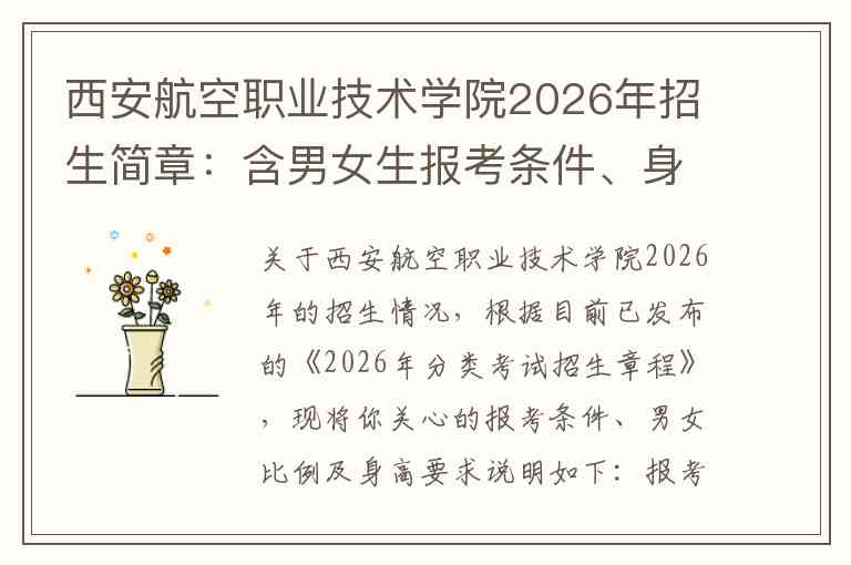 关于西安航空职业技术学院2026年的招生情况,根据目前已发布的《2026年分类考试招生章程》,现将你关心的报考条件、男女比例及身高要求说明如下:
