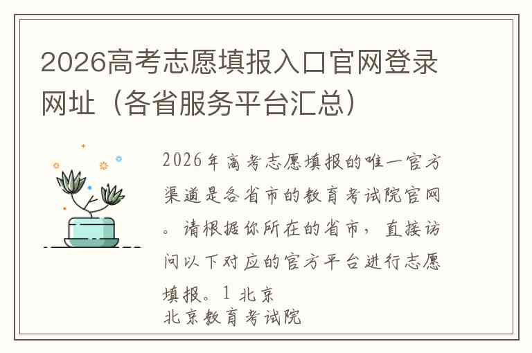 2026年高考志愿填报的唯一官方渠道是各省市的教育考试院官网。请根据你所在的省市,直接访问以下对应的官方平台进行志愿填报。