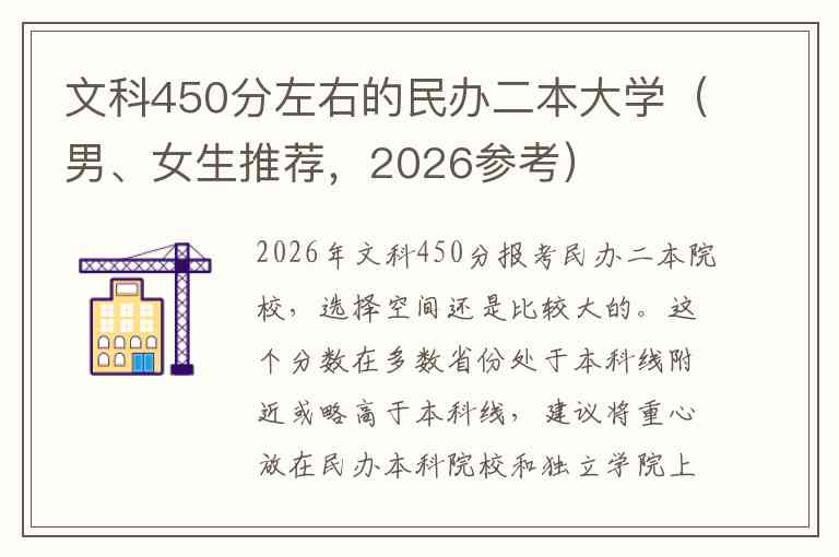2026年文科450分报考民办二本院校,选择空间还是比较大的。这个分数在多数省份处于本科线附近或略高于本科线,建议将重心放在民办本科院校和独立学院上,同时可以关注部分公办院校的中外合作或冷门专业。