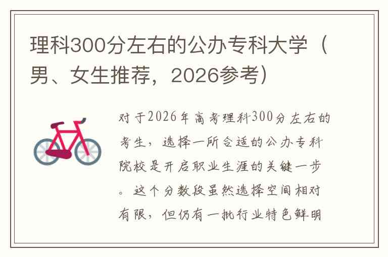 对于2026年高考理科300分左右的考生,选择一所合适的公办专科院校是开启职业生涯的关键一步。这个分数段虽然选择空间相对有限,但仍有一批行业特色鲜明、就业前景良好的公办院校值得重点关注。以下按专业方向分类整理了部分院校信息,供考生和家长参考。