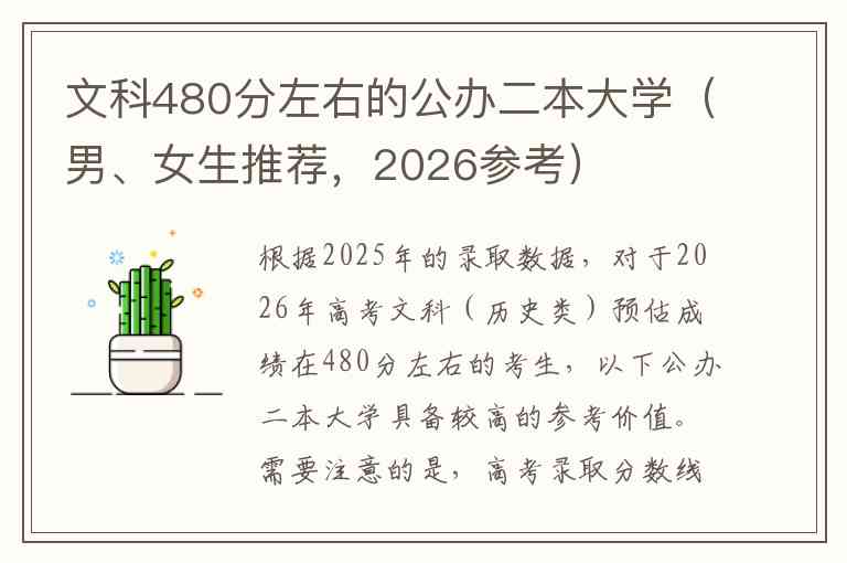 根据2025年的录取数据,对于2026年高考文科(历史类)预估成绩在480分左右的考生,以下公办二本大学具备较高的参考价值。需要注意的是,高考录取分数线存在显著的区域差异,下文将按不同省份的招录数据进行分类推荐,供你根据所在省份进行参考。