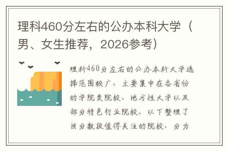 理科460分左右的公办本科大学选择范围较广,主要集中在各省份的学院类院校、地方性大学以及部分特色行业院校。以下整理了该分数段值得关注的院校,分为“特色就业类”和“综合师范类”两大方向,并分别给出适合男生和女生的报考建议,供2026届考生参考。