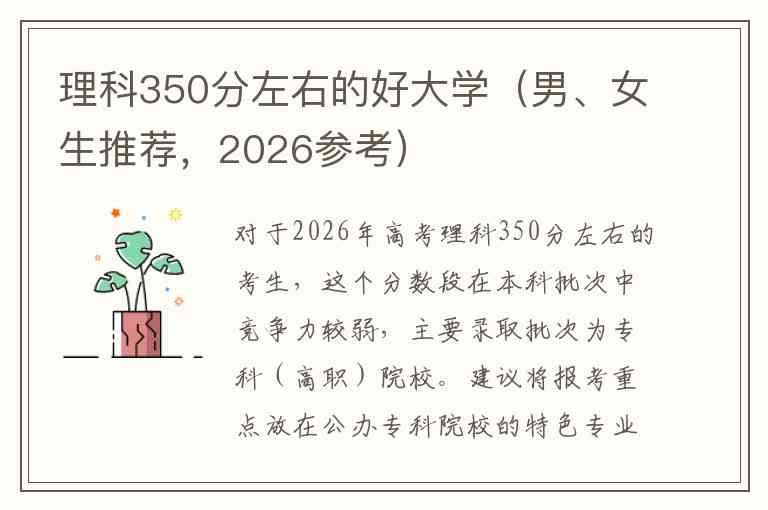 对于2026年高考理科350分左右的考生,这个分数段在本科批次中竞争力较弱,主要录取批次为专科(高职)院校。建议将报考重点放在公办专科院校的特色专业,以及部分民办本科院校的专科或冷门专业上。以下从院校推荐和专业选择两个维度,分别给出建议。