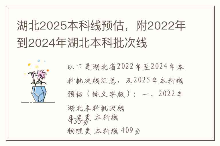 以下是湖北省2022年至2024年本科批次线汇总,及2025年本科线预估(纯文字版):