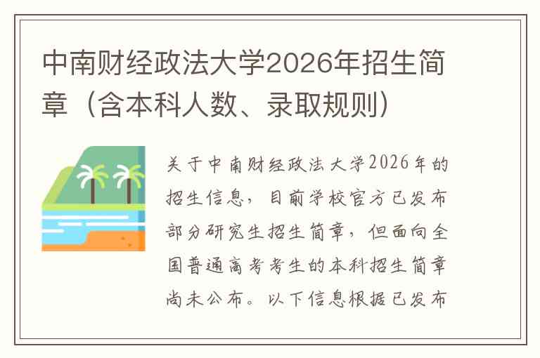 关于中南财经政法大学2026年的招生信息,目前学校官方已发布部分研究生招生简章,但面向全国普通高考考生的本科招生简章尚未公布。以下信息根据已发布的硕士生招生章程及相关政策整理,供您参考。最终的本科招生政策请以学校6月左右发布的官方文件为准。