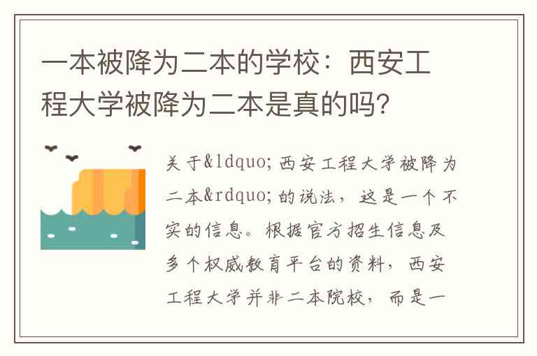 关于“西安工程大学被降为二本”的说法,这是一个不实的信息。根据官方招生信息及多个权威教育平台的资料,西安工程大学并非二本院校,而是一所在全国大部分省份均纳入本科一批次招生的大学。