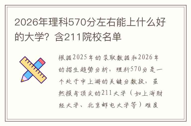 根据2025年的录取数据和2026年的招生趋势分析,理科570分是一个处于中上游的关键分数段,虽然报考顶尖的211大学(如上海财经大学、北京邮电大学等)难度较大,但完全有机会被多所地理位置相对偏远或具有行业特色的211大学录取。