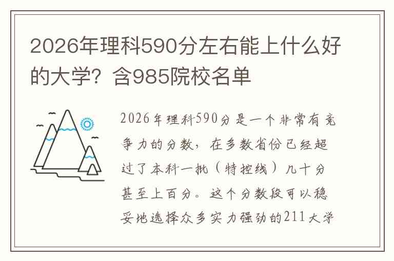 2026年理科590分是一个非常有竞争力的分数,在多数省份已经超过了本科一批(特控线)几十分甚至上百分。这个分数段可以稳妥地选择众多实力强劲的211大学,并且有机会冲刺部分地理位置相对偏远或专业录取线相对较低的985院校。