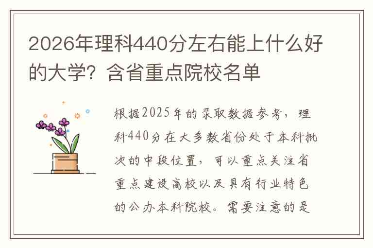 根据2025年的录取数据参考,理科440分在大多数省份处于本科批次的中段位置,可以重点关注省重点建设高校以及具有行业特色的公办本科院校。需要注意的是,不同省份的分数线差异较大,以下名单主要基于部分省份的录取情况整理,具体还需结合你所在省份的位次进行综合判断。