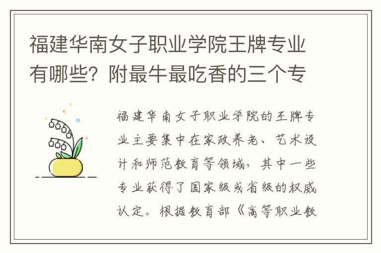 福建华南女子职业学院的王牌专业主要集中在家政养老、艺术设计和师范教育等领域,其中一些专业获得了国家级或省级的权威认定。