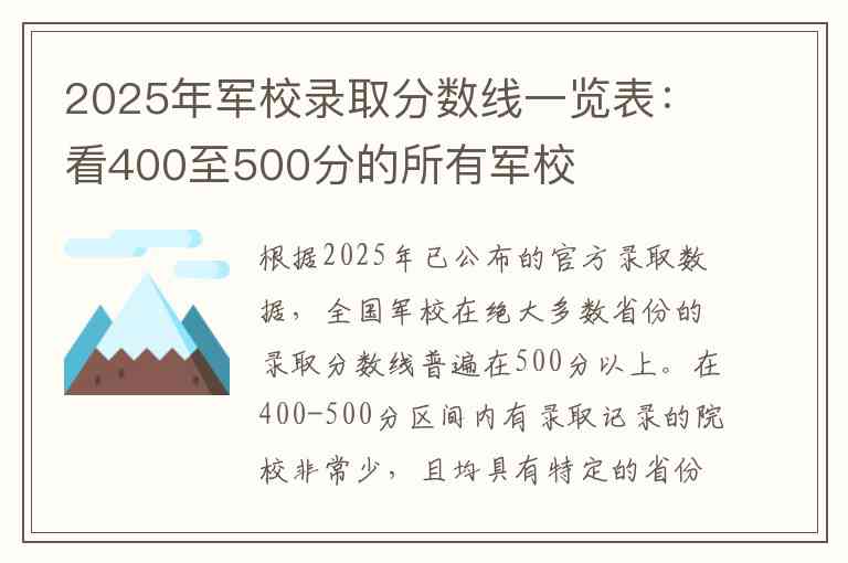 根据2025年已公布的官方录取数据,全国军校在绝大多数省份的录取分数线普遍在500分以上。在400-500分区间内有录取记录的院校非常少,且均具有特定的省份和专业限制。以下是该分数段内的具体院校名单及录取情况:
