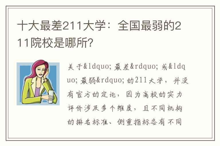 关于“最差”或“最弱”的211大学,并没有官方的定论,因为高校的实力评价涉及多个维度,且不同机构的排名标准、侧重指标各有不同。不过,综合近年来多个版本的大学排行榜(如软科、校友会等)以及录取分数线、地理位置、学科结构等公开数据,确实有一些211大学因地理位置相对偏远、经费预算有限或学科设置较为冷门等原因,在综合排名中常常处于靠后的位置。