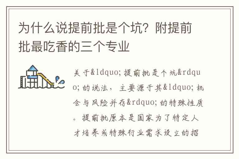关于“提前批是个坑”的说法,主要源于其“机会与风险并存”的特殊性质。提前批原本是国家为了特定人才培养或特殊行业需求设立的招生批次,但如果考生不了解规则盲目填报,很容易陷入被动。