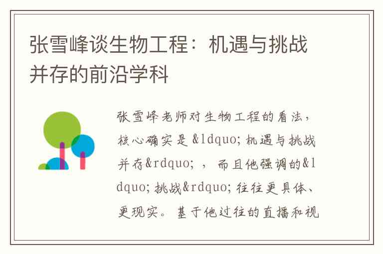 张雪峰老师对生物工程的看法,核心确实是 “机遇与挑战并存” ,而且他强调的“挑战”往往更具体、更现实。基于他过往的直播和视频观点,可以总结为以下几点纯文字分析: