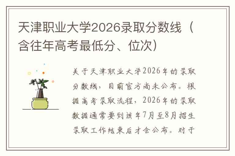 关于天津职业大学2026年的录取分数线,目前官方尚未公布。根据高考录取流程,2026年的录取数据通常要到该年7月至8月招生录取工作结束后才会公布。