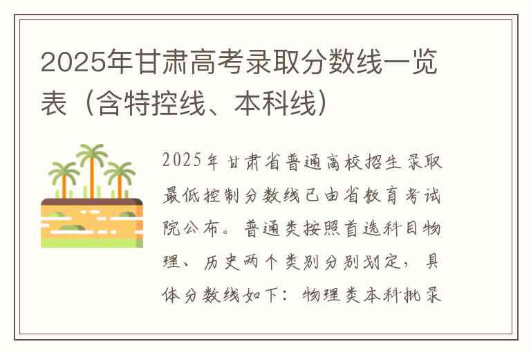 2025年甘肃省普通高校招生录取最低控制分数线已由省教育考试院公布。普通类按照首选科目物理、历史两个类别分别划定,具体分数线如下: