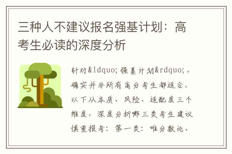 针对“强基计划”,确实并非所有高分考生都适合。以下从本质、风险、适配度三个维度,深度分析哪三类考生建议慎重报考: