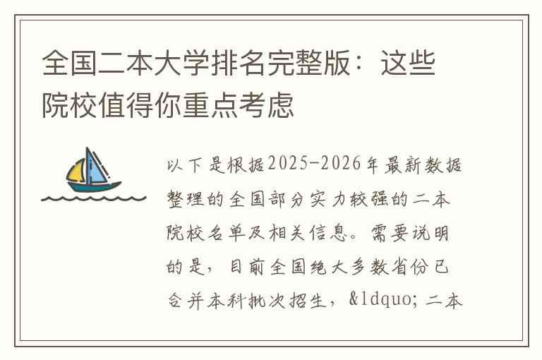 以下是根据2025-2026年最新数据整理的全国部分实力较强的二本院校名单及相关信息。需要说明的是,目前全国绝大多数省份已合并本科批次招生,“二本”通常指在本科二批或本科批中录取分数相对适中的公办及民办院校。