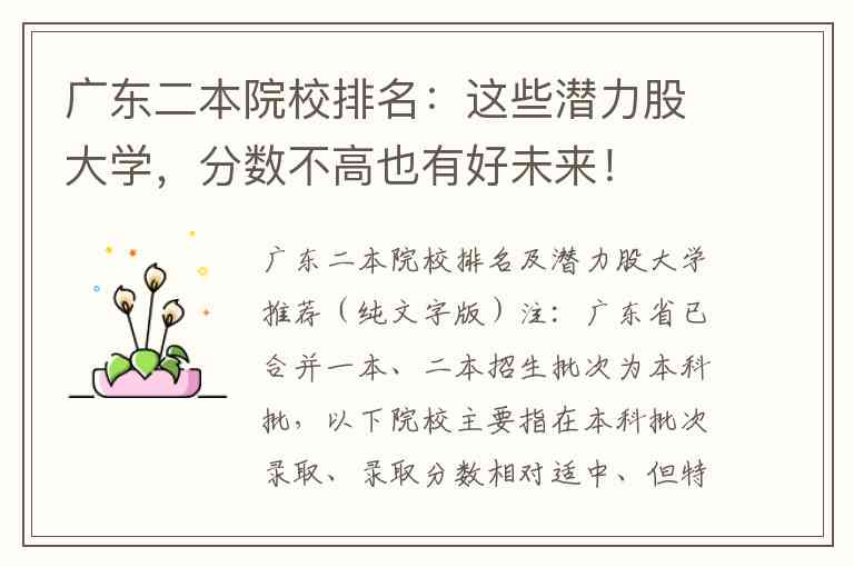 注:广东省已合并一本、二本招生批次为本科批,以下院校主要指在本科批次录取、录取分数相对适中、但特色鲜明、就业前景良好的公办及部分民办本科院校。