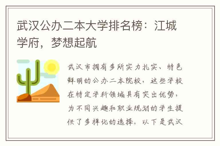 武汉市拥有多所实力扎实、特色鲜明的公办二本院校,这些学校在特定学科领域具有突出优势,为不同兴趣和职业规划的学生提供了多样化的选择。