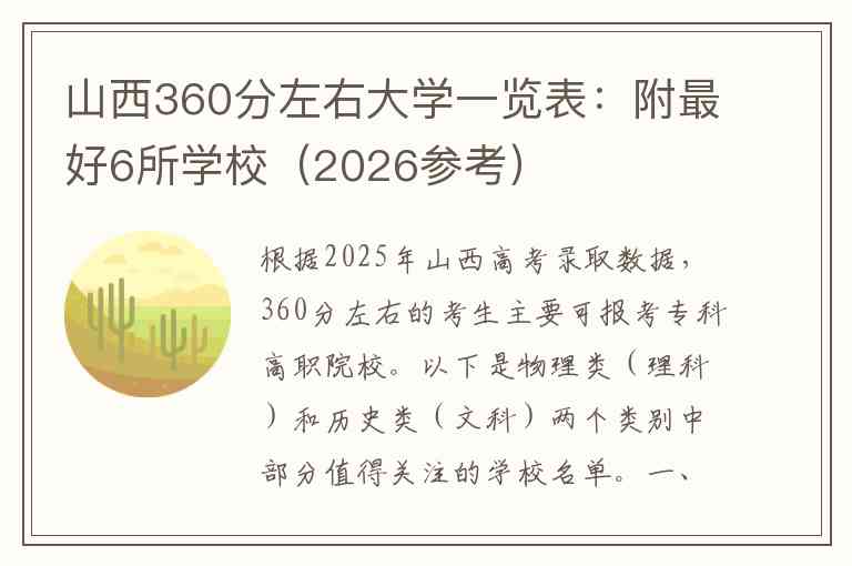 根据2025年山西高考录取数据,360分左右的考生主要可报考专科高职院校。以下是物理类(理科)和历史类(文科)两个类别中部分值得关注的学校名单。