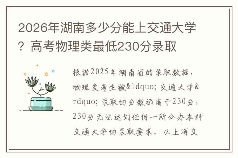 根据2025年湖南省的录取数据,物理类考生被“交通大学”录取的分数远高于230分,230分无法达到任何一所公办本科交通大学的录取要求。