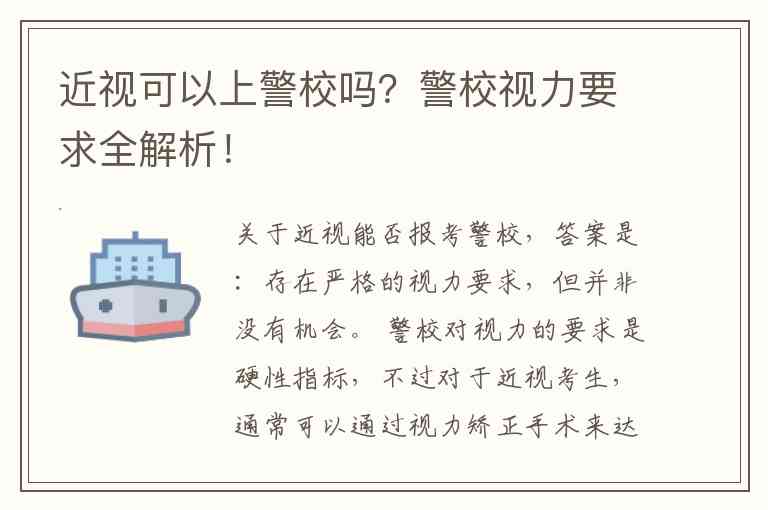 近视并不意味着警校之路就此中断。如果你立志从警,且年龄、身高、体重等其他条件均符合要求,完全可以通过提前规划、接受正规的视力矫正手术来满足体检标准。建议有志报考的考生密切关注各省教育考试院和目标院校发布的最新招生通知,并提前做好身体上的准备。