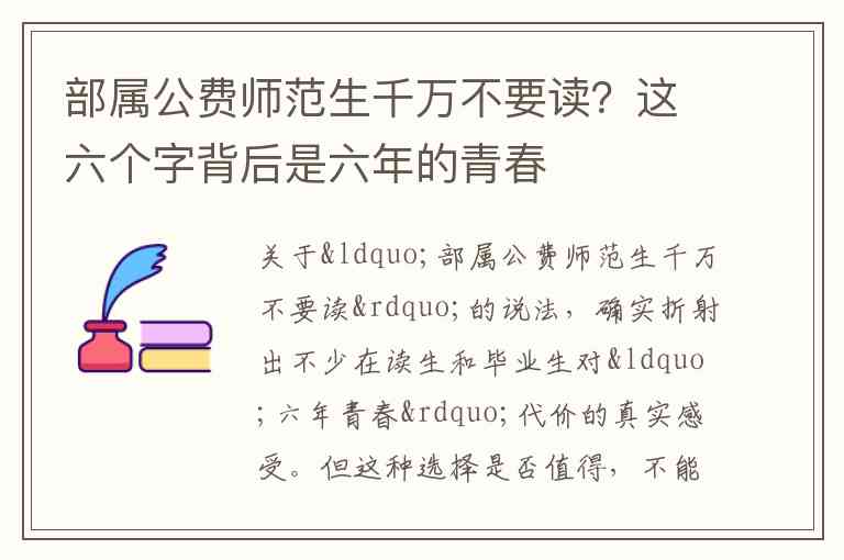 关于“部属公费师范生千万不要读”的说法,确实折射出不少在读生和毕业生对“六年青春”代价的真实感受。但这种选择是否值得,不能简单用“千万不要”来概括。我试着把这六年背后的利弊、现实困境和适合人群拆解清楚,供你参考。