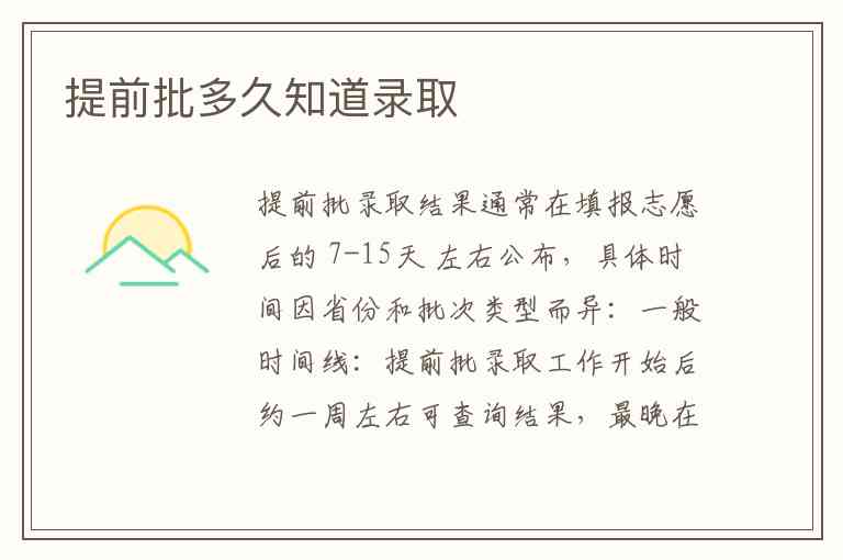 提前批录取结果通常在填报志愿后的 7-15天 左右公布,具体时间因省份和批次类型而异: