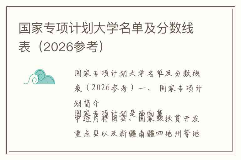国家专项计划是面向集中连片特困县、国家级扶贫开发重点县以及新疆南疆四地州等地区考生的定向招生政策。2026年,该计划继续实施,全国有超过300所高校参与招生,包含众多中央部门所属高校和地方重点高校。
