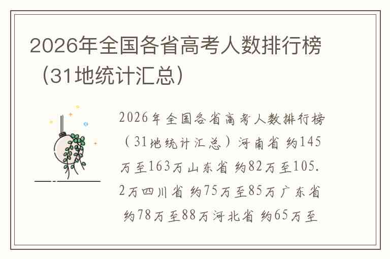数据说明:以上为2026年各省高考人数预测统计,因各省公布时间及口径存在差异,部分数据为预测区间,实际人数请以各省教育考试院官方最终公布为准。