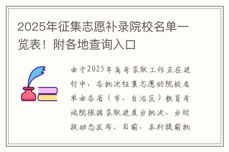由于2025年高考录取工作正在进行中,各批次征集志愿的院校名单由各省(市、自治区)教育考试院根据录取进度分批次、分时段动态发布。目前,本科提前批、本科批及部分专科批的征集志愿工作已在多省陆续开展。