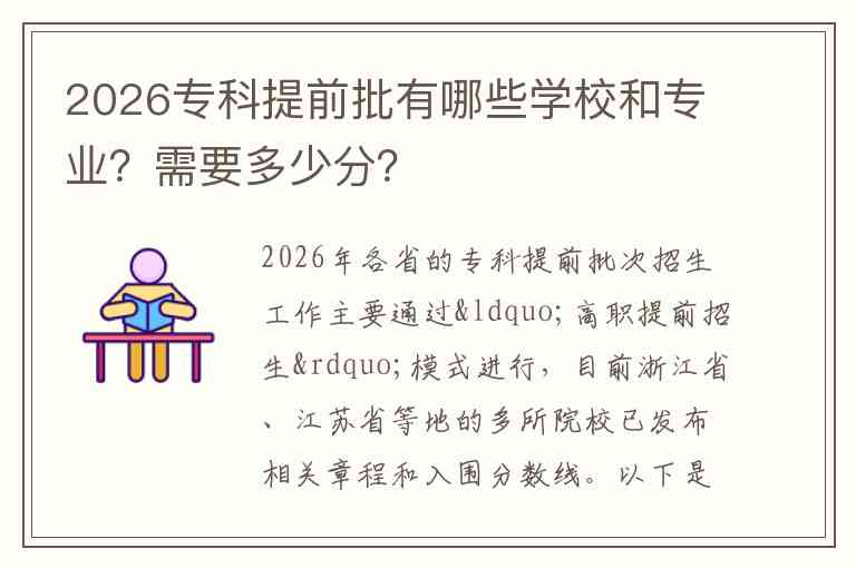 2026年各省的专科提前批次招生工作主要通过“高职提前招生”模式进行,目前浙江省、江苏省等地的多所院校已发布相关章程和入围分数线。以下是根据当前已公布信息整理的学校和专业名单及分数要求,供你参考。