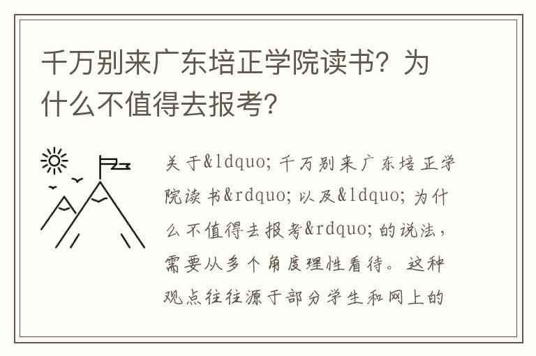 关于“千万别来广东培正学院读书”以及“为什么不值得去报考”的说法,需要从多个角度理性看待。这种观点往往源于部分学生和网上的片面看法,但实际情况更为复杂。以下从几个方面分析这所学校的特点与争议,供你参考。