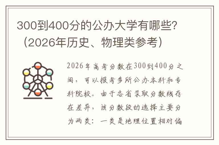 2026年高考分数在300到400分之间,可以报考多所公办本科和专科院校。由于各省录取分数线存在差异,该分数段的选择主要分为两类:一类是地理位置相对偏远或新成立的部分公办本科院校,另一类是数量众多、专业特色鲜明的公办专科院校(高职大专)。