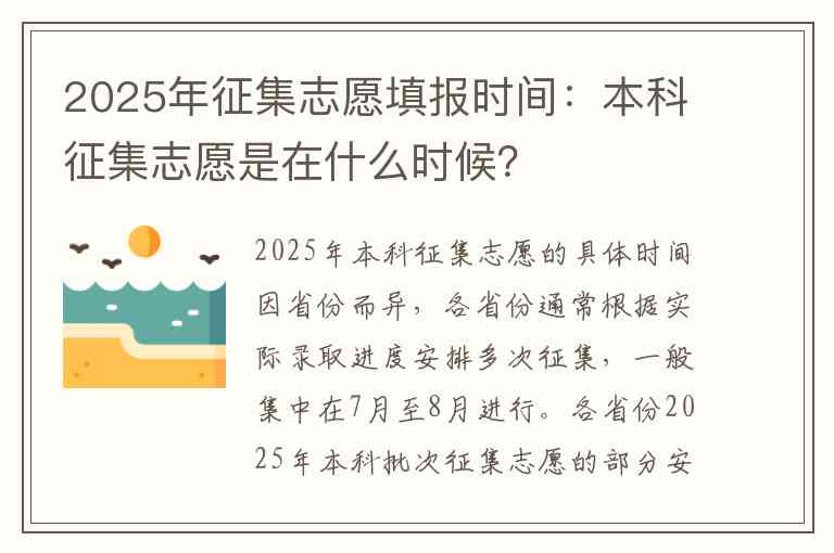 2025年本科征集志愿的具体时间因省份而异,各省份通常根据实际录取进度安排多次征集,一般集中在7月至8月进行。