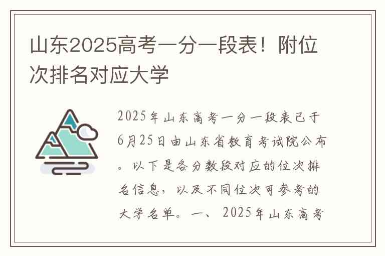 2025年山东高考一分一段表已于6月25日由山东省教育考试院公布。以下是各分数段对应的位次排名信息,以及不同位次可参考的大学名单。