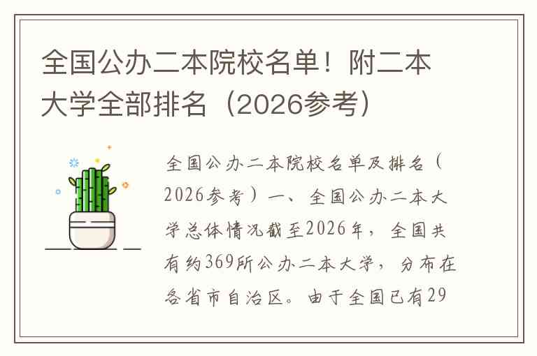 截至2026年,全国共有约369所公办二本大学,分布在各省市自治区。由于全国已有29个省市实行新高考,合并了本科批次,“二本大学”通常指在本科线以上、特殊类型控制线以下录取的公办本科院校。