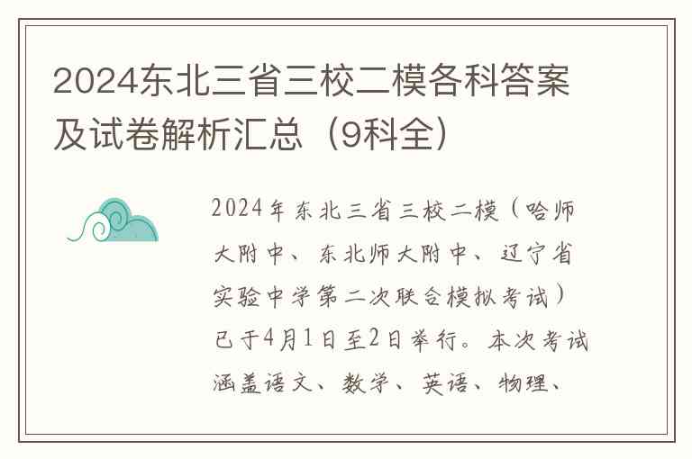 2024年东北三省三校二模(哈师大附中、东北师大附中、辽宁省实验中学第二次联合模拟考试)已于4月1日至2日举行。本次考试涵盖语文、数学、英语、物理、历史、化学、生物、政治、地理共9个科目,以下是根据网络资源整理的各科试卷及答案解析汇总信息。