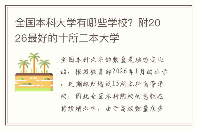 全国本科大学的数量是动态变化的,根据教育部2026年1月的公示,近期拟新增设15所本科高等学校,因此全国本科院校的总数在持续增加中。由于高校数量众多且名单不断更新,要获取最完整、最权威的全国所有本科大学名单,建议直接查阅教育部官方网站发布的最新全国高等学校名单。